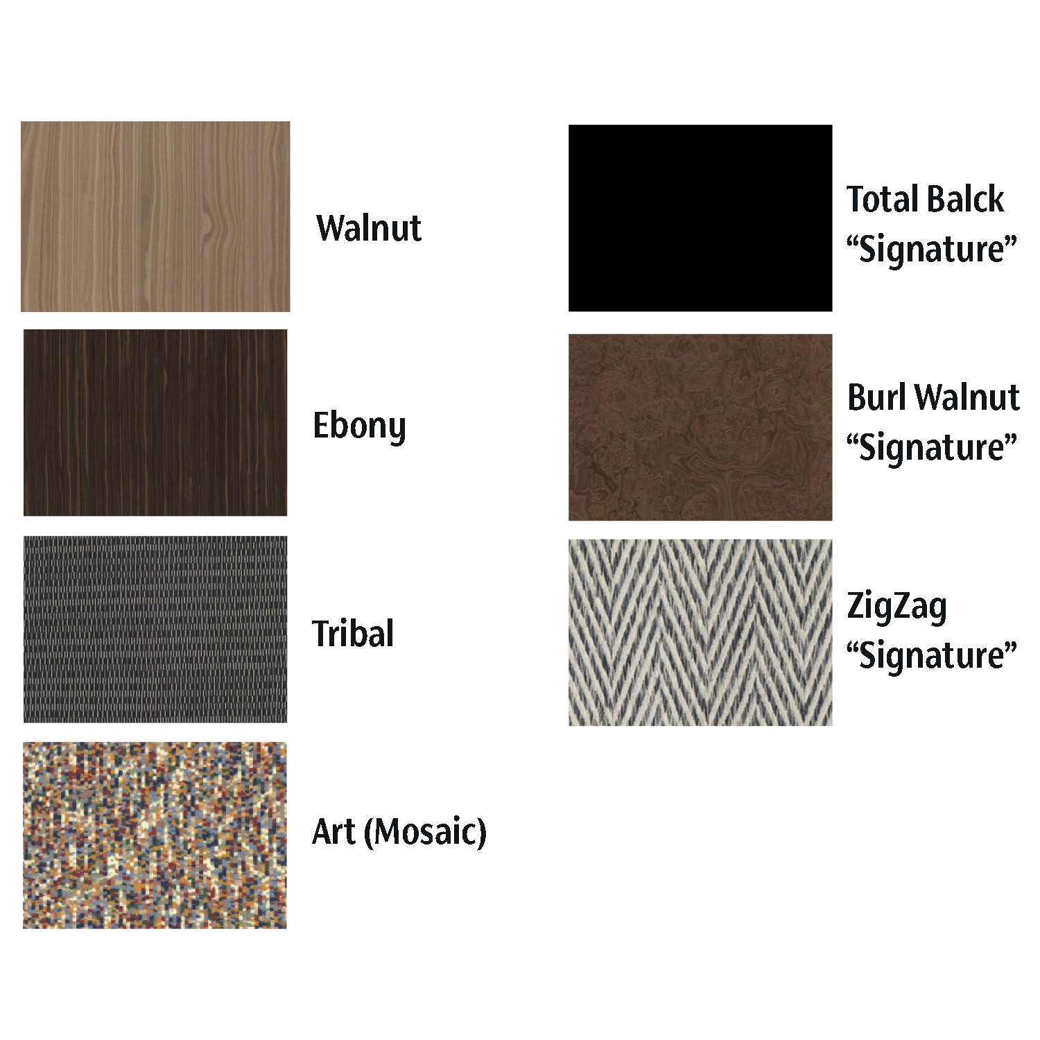 U-Basik 6/3は、ウォールナット、エボニー、トライバル、モザイク(アート)、トータルバルク Signature、バールウォールナット Signature、ZigZag Signatureからお選びいただけます。