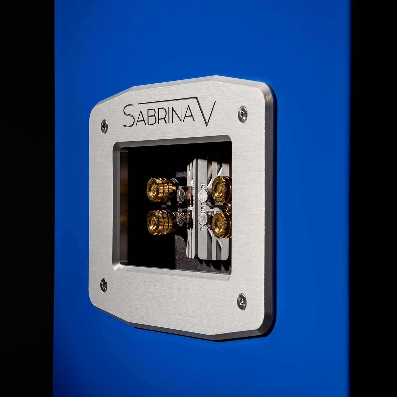新しいリアパネル設計により、メンテナンスや調整が格段に容易になりました。従来のSabrinaでは底面からのアクセスが必要でしたが、Sabrina Vでは高品質の工具不要サムスクリューで固定され、ツイーターやミッドレンジの抵抗値変更が迅速かつ直感的に行えます。背面には精巧に削り出されたアルミフレームが装飾され、Sabrina V ロゴが刻まれています。