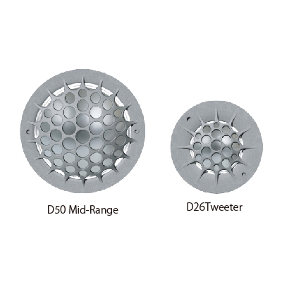 中高域の拡散特性をさらに向上させるために、コンピューターシミュレーションにより最適化したディフューザーをD50 Mid-Range とD26 Tweeterに装備。位相特性に優れさらに正確な空間再現能力を得ています。